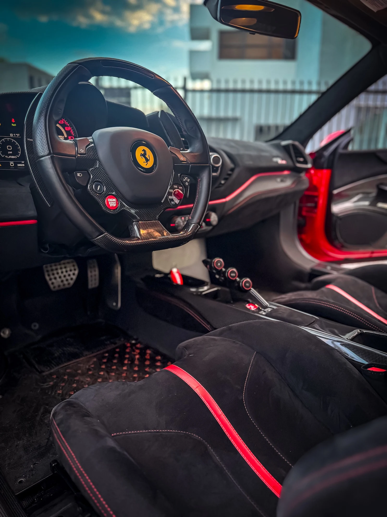 Inside, the 488 Pista features a race-inspired cockpit with lightweight materials, Alcantara® upholstery, and carbon fiber details. The digital instrument cluster and intuitive controls keep you focused on the drive, while advanced driver-assistance features enhance both safety and performance.